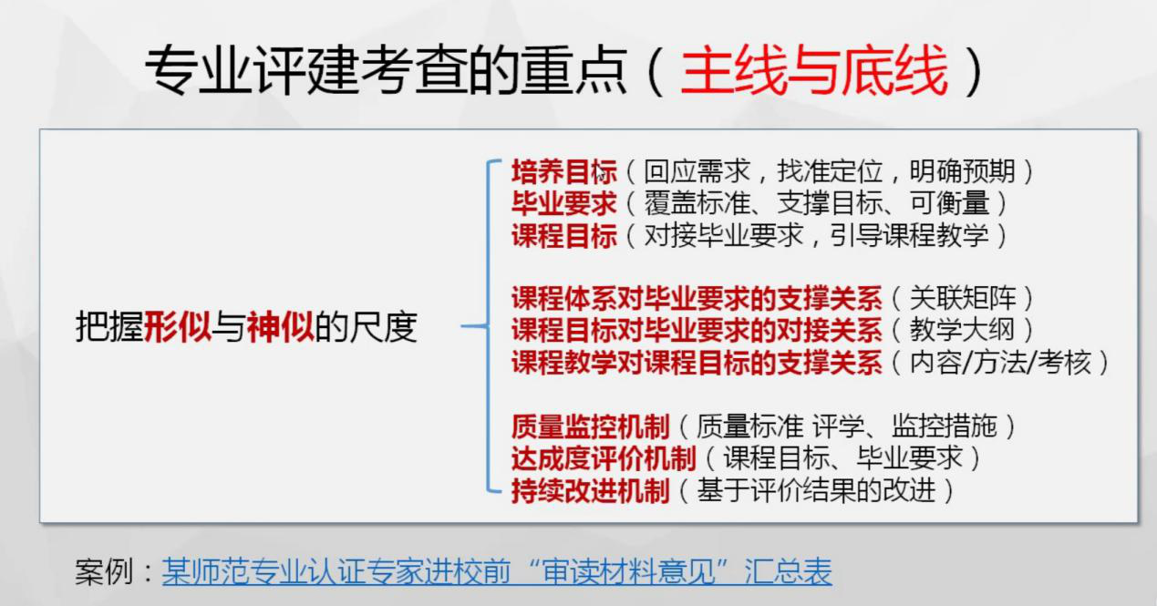 宋教授从师范类专业认证标准切入,详细阐述了师范类专业标准“是什么”、开展师范类专业认证“为什么”、学校及专业应该“怎么做”等问题。师范学校专业认证要能够依据认证标准,紧紧围绕“主线和底线”,开展自评自建。在认证主线上,反向设计要能够初步做到面向需求制定培养目标,形成培养目标与毕业要求的逻辑关联,毕业要求的分解指标点具有一定的可衡量性,所对应课程目标总体上趋于合理;在正向施工上,通过课程大纲修订,初步完成“课程支撑的毕业要求和涉及的指标点”“教学环节、方法手段与课程教学目标对应”“课程考核和成绩评定方法及课程教学目标关联”“课程教学目标、达成途径与主要判据”“课程达成度评价方案”“课程教学目标评分标准”等四表一案一标产出机制设计;在认证底线上,能够运用课程考核分析法,逐项对标毕业要求的指标点,以理论课程考核成绩为主要依据,对毕业要求的达成情况进行局部评价与分析,能够综合校友反馈和用人单位问卷以及麦克思质量评估数据形成培养目标达成情况评价依据。宋教授从培养目标、毕业要求、课程与教学、合作与实践教学、质量保障五方面具体谈论了学校如何围绕落实主线和举证底线展开教学工作。