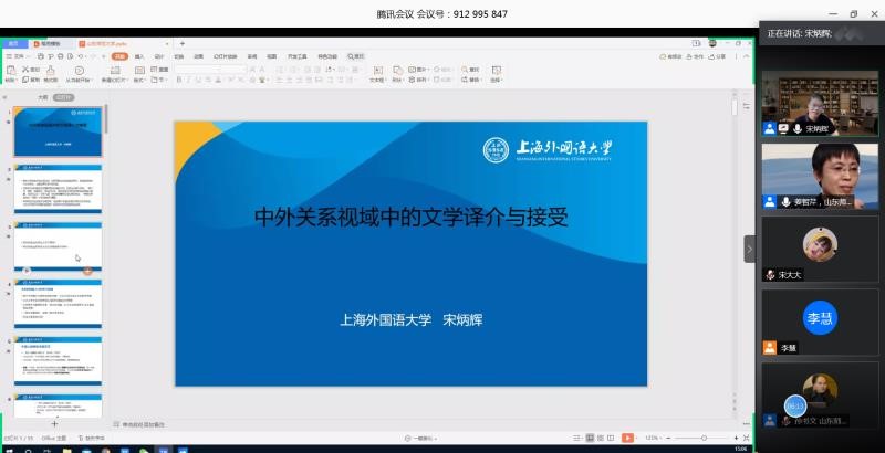 9月11日下午3点,文学院庆祝建校70周年系列学术讲座之“中外关系视域中的文学译介与接受”在腾讯会议线上平台成功举行。本次讲座由文学院比较文学与世界文学专业学位点负责人、博士生导师姜智芹教授主持,特邀上海外国语大学教授、博士生导师宋炳辉先生主讲。文学院院长孙书文教授致欢迎辞,文学院多名教师及本科生、研究生和博士生共同聆听了此次讲座。