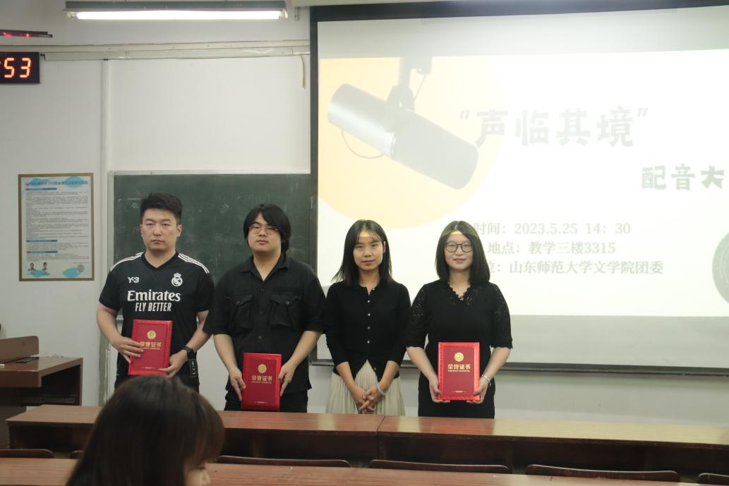 为丰富校园文化生活,培养和提高研究生的文化品位和艺术修养,营造奋发向上的校园文化氛围,5月25日,文学院“声临其境”配音大赛于教学三楼3315教室成功举办。本次比赛由山东师范大学文学院团委主办,由山东师范大学文学院研究生会承办。文学院研究生辅导员徐金、杜云飞、2022级本科生辅导员李红担任本次比赛评委。文学院10位选手经过精心的准备,将自己的想象力和创造力发挥的淋漓尽致,呈现了一场精彩绝伦的表演。整场比赛异彩纷呈,掌声不绝于耳。