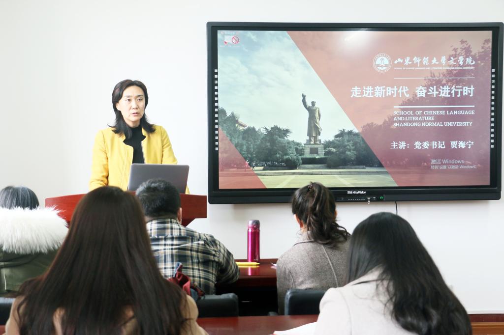 3月15日下午,文学院党委书记贾海宁在千佛山校区教学三楼3338教室为研究生们带来一堂题为“走进新时代,奋斗进行时”的形势与政策课。贾海宁首先代表学院领导班子和全体教职工向同学们致以新学期的问候,课上,她首先从两会的历史、召开时间、目标任务、会议内容和重大意义等几个方面,向同学们传达并讲解了两会精神。并结合本年度政府工作报告,带领大家回顾了我国一路发展走过的不平凡、不容易的五年。随后,她介绍了山东省建立新旧动能转换试验区的情况,结合山东省委书记刘家义的讲话,与同学们一起探讨山东省作为人口与资源大省取得成绩,和新时代背景下面临的严峻形势。最后,贾海宁向同学们传达介绍了2018年学校工作要点,指出学校将加快推进综合改革,进一步提升教育质量,加大力度鼓励支持科研创新。当前,文学院在一流学科建设和全国第四轮学科评估中取得了优异成绩,新学期中,希望大家同学们抓住机遇、珍惜光阴,勤勉治学、继往开来,引领校园风尚,展现文院学子的风采。为个人成长成才和学院建设发展发挥光热和力量。