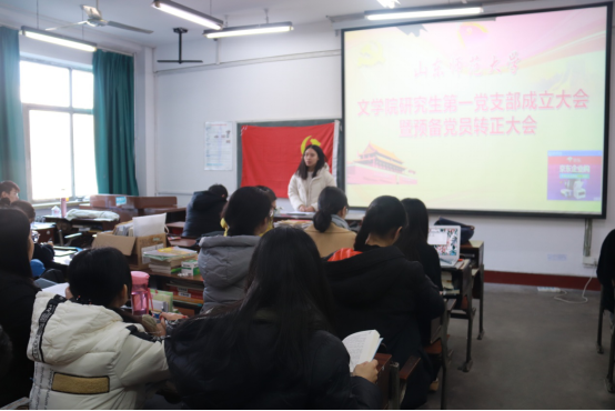 12月13日中午,文学院于千佛山校区教学三楼3344教室召开研究生第一党支部成立暨预备党员转正大会。此次大会由研究生辅导员徐金主持,党委副书记巩固出席此次会议。