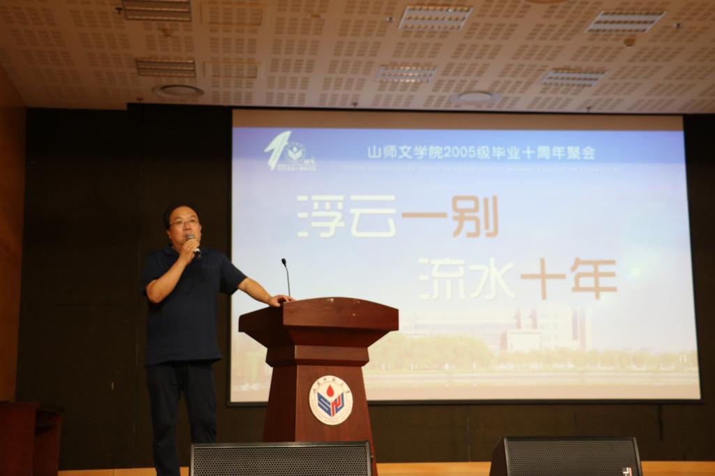 师恩难忘,师道谨承。返校聆听授业恩师的教诲,是全体校友的共同心愿。在同学们热烈的掌声中,常庆教授、李掖平教授、孙书文院长先后走上讲台传道授业解惑。常庆教授说,当年新校区位置偏远、交通不便,老师们起早贪黑、两地奔波都很辛苦,但大家心里想得最多的,还是如何保证好教学的时间和质量。常老师讲述着课堂背后的感人故事,也道出了为人师者的内涵真谛。李掖平教授说,文学让我们相识、文学让我们相知、文学让我们相通,文学的魅力让文学院师生们凝聚在一起,也将继续滋养文学院师生继往开来接续奋斗。李老师诗意的讲演,再一次引领同学们感受文学的魅力。孙书文院长代表学院热烈欢迎2005级校友返校,介绍了文学院十年来改革发展不断跨越的新成就和未来建设发展的思路方向,希望广大校友走得再远都不要忘记自己身为山师人、文院人,走得再久都不忘常回来走一走、看一看,不忘初心、扎实工作、再创佳绩,为祖国建功立业,为母校增光添彩。