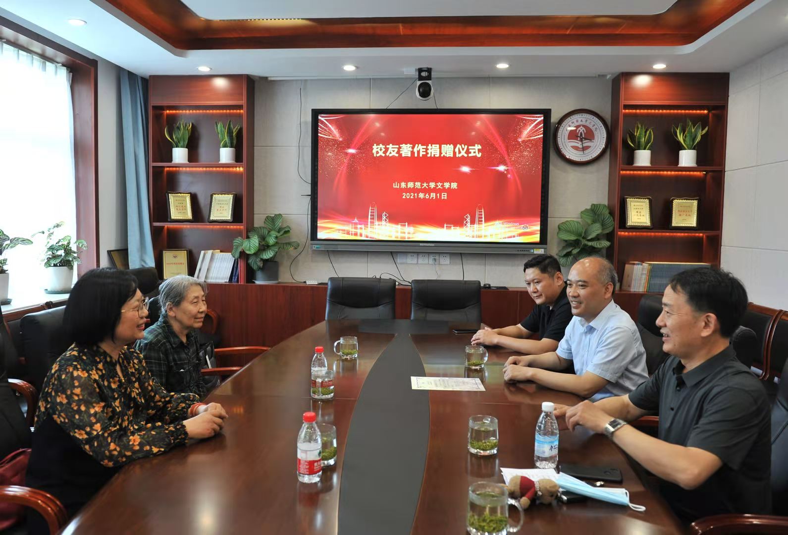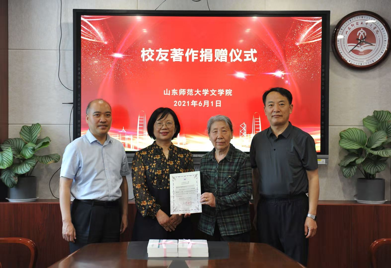 两位校友表示,作为文学的学生,她们为文学院今天所取得成绩感到无比自豪和骄傲。据周女士介绍,他们一家与山师有着不解之缘,她和她的哥哥周明、丈夫王霄汉、女儿王莹都是山师中文系的校友,一个外孙女是山师经济学院的在校生,另一个外孙女今年也准备报考山师。周女士表示,他的哥哥周明虽然在南京工作、生活多年,但对山师中文系一直念念不忘,因为年龄和疫情的原因近期不能来济南,希望通过自己的亲人将个人的研究成果捐赠给学院,以此方式为母校发展贡献自己的微薄之力。