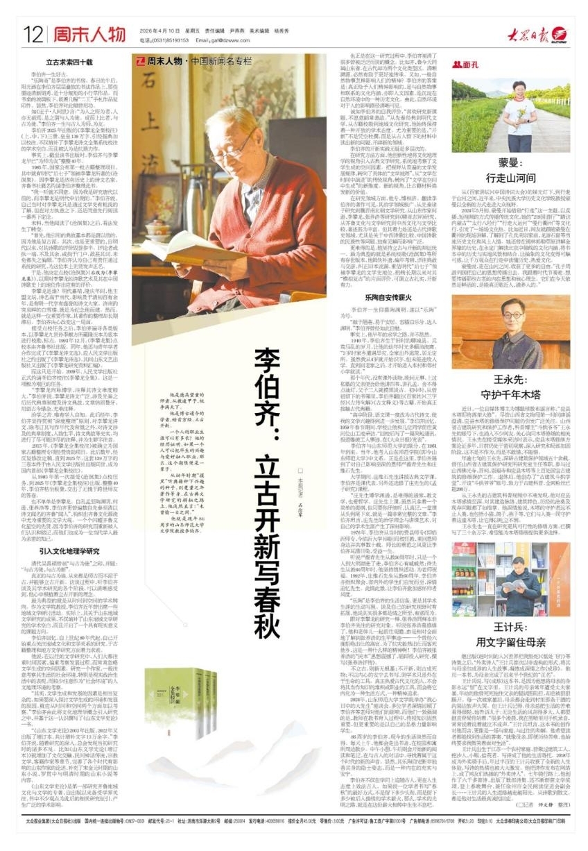 4月10日,《大众日报》“周末人物”专栏以《李伯齐:立古开新写春秋》为题,报道山东师范大学文学院教授李伯齐潜心治学、推动中华优秀传统文化传承创新的事迹。全文如下: