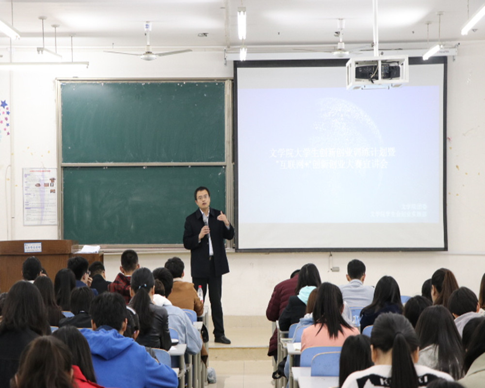 为激发文学院学子的创新创业热情,鼓励文学院学子积极参与创新创业活动,4月4日晚,文学院于长清湖校区综合教学楼C区218教室举办文学院大学生创新创业训练计划暨“互联网+”创新创业大赛宣讲会。文学院党委副书记巩固担任宣讲人,2015级辅导员张婷担任主持人,2015级辅导员郑鹏凯同文院学子共同参与此次宣讲会。